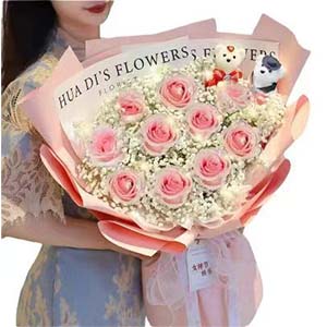 11枝粉玫瑰加满天星加2小熊