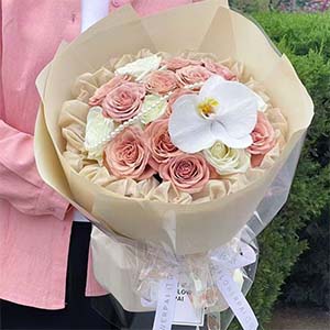 卡布奇诺加白玫瑰混搭19枝加蝴蝶兰