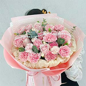 粉玫瑰加粉康乃馨混搭19枝加尤加利