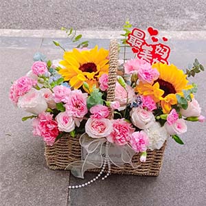 粉玫瑰加粉色看下混搭16枝加桔梗加向日葵加尤加利