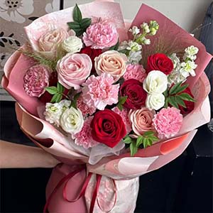 粉玫瑰加粉康乃馨加红玫瑰香槟玫瑰混搭19枝加金鱼草桔梗