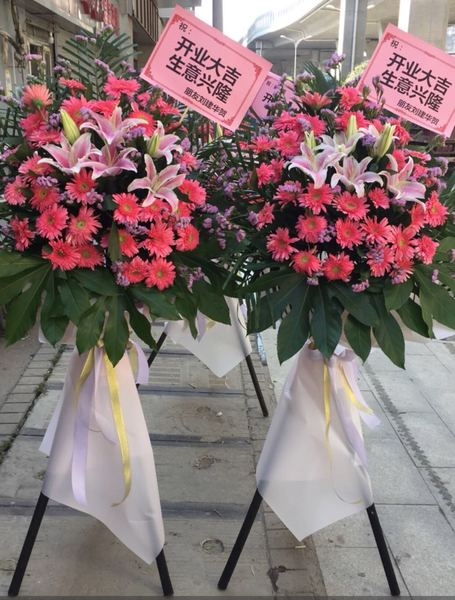 开业花篮一对,粉色佛朗,粉色百合,紫色配花,散尾
